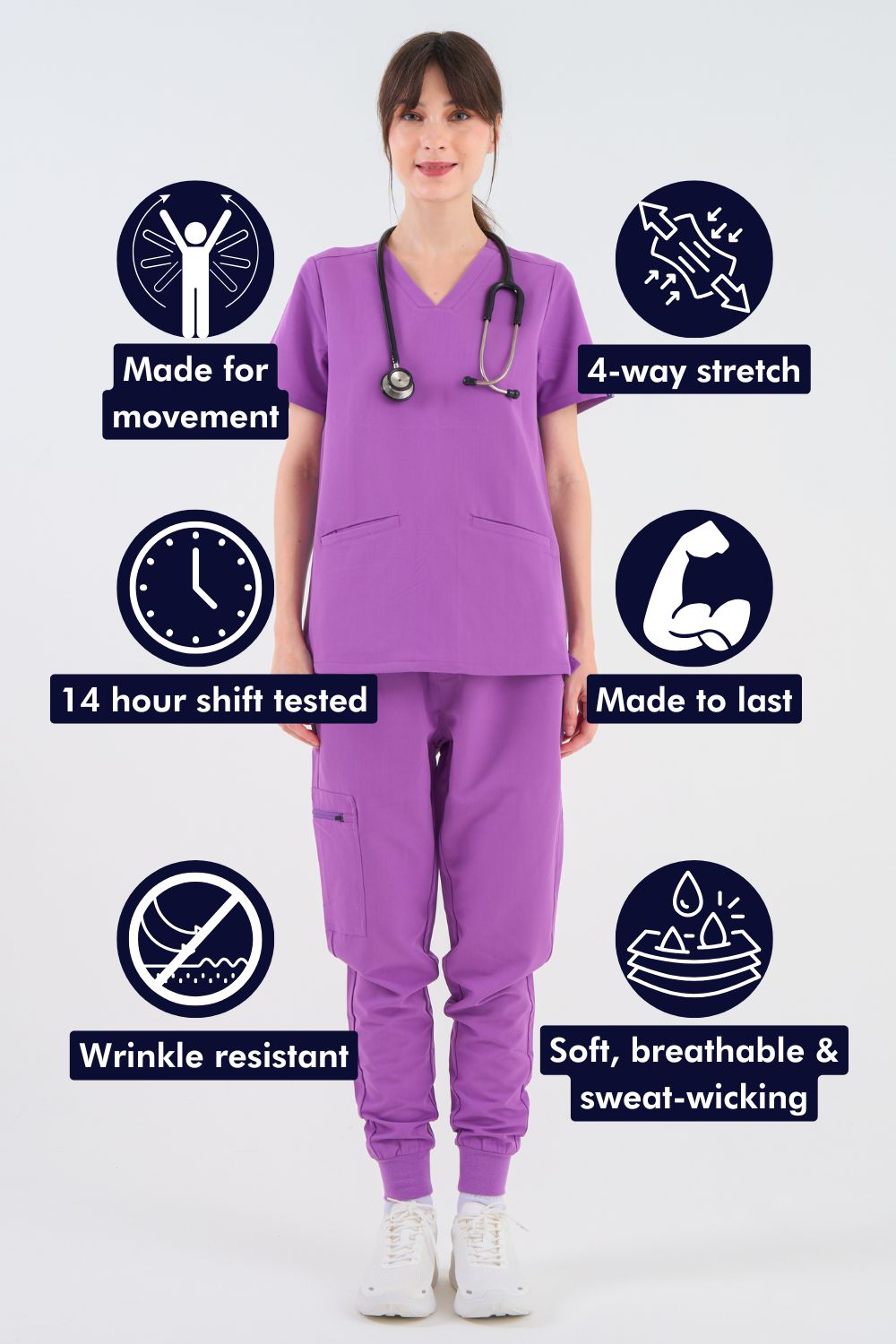 With 3 roomy pockets, this scrub top keeps everything you need close at hand. The subtle tailoring delivers a relaxed yet polished look, while sweat wicking, 4 way stretch fabric lets you move and bend with ease.